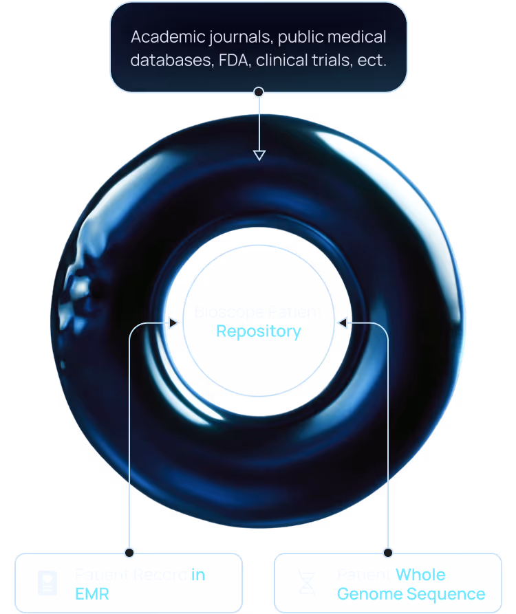 Bioscope.ai continuously analyzes everything about your patients – from their genomes to their entire medical records. All while staying up to date on the latest medical research.