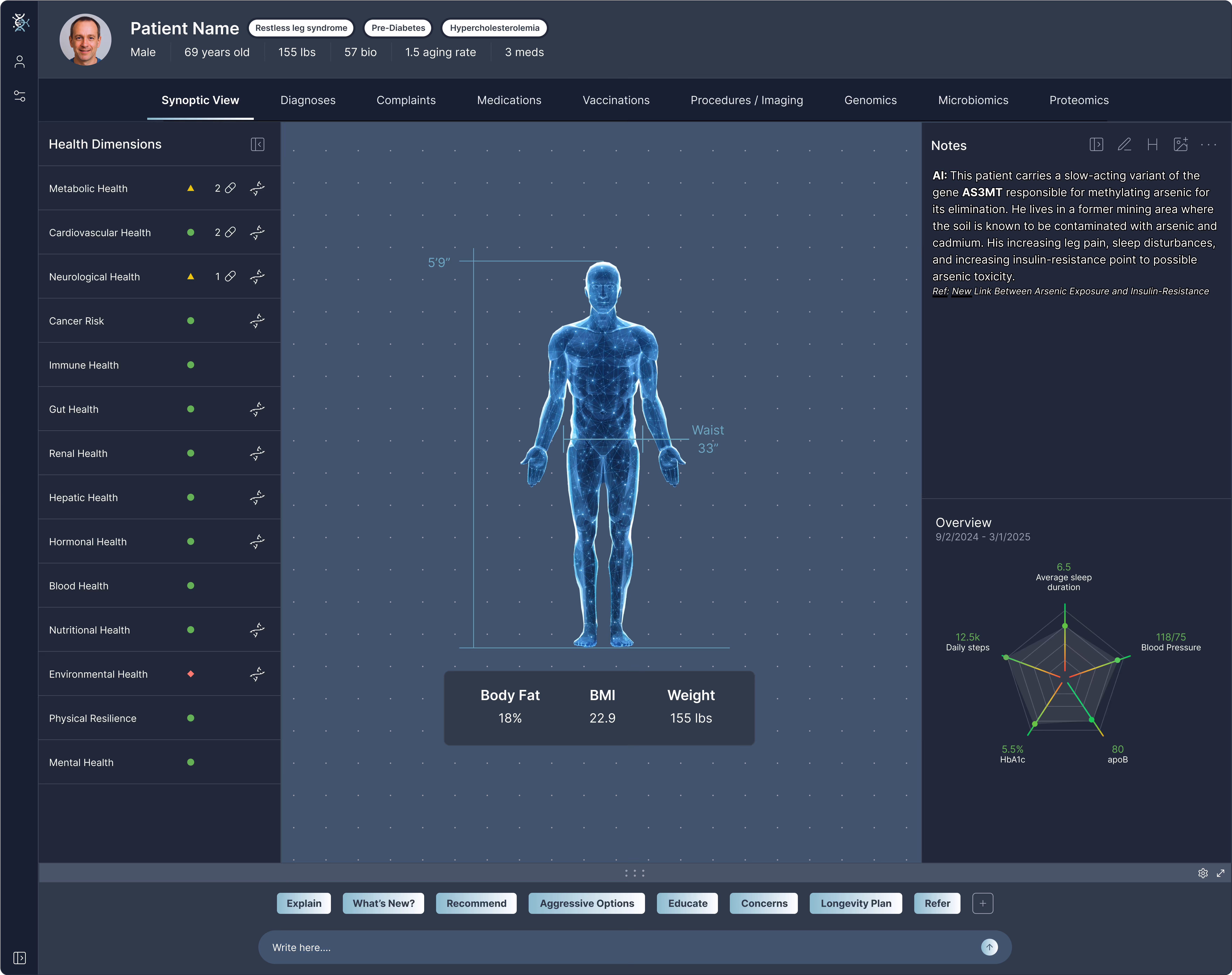 Every time you open the Bioscope.ai window, you’re greeted with a synoptic dashboard — a real-time, high-level overview of your patient’s health. Key dimensions like cardiovascular status, cancer risk, metabolic flexibility, and more are presented with intuitive gauges and visual cues. Tap any area to drill down into metrics, clinical images, and supporting science.