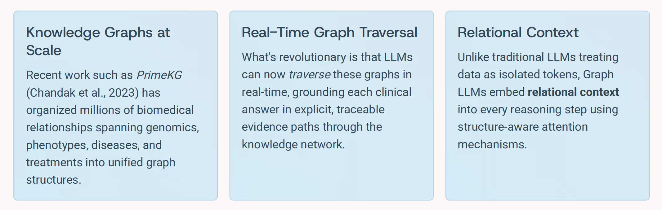 This is not abstract theory - it's a fundamental shift in how AI systems understand medicine. When a Graph LLM reads a patient chart, it doesn't simply summarize the contents. It navigates the information landscape, mentally connecting symptoms to biological mechanisms, treatments to outcomes, risks to protective factors - creating a living map of clinical understanding.